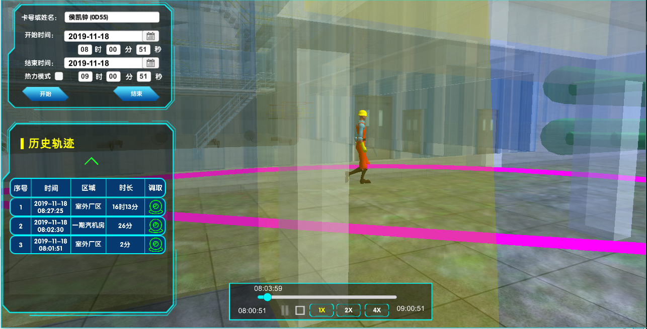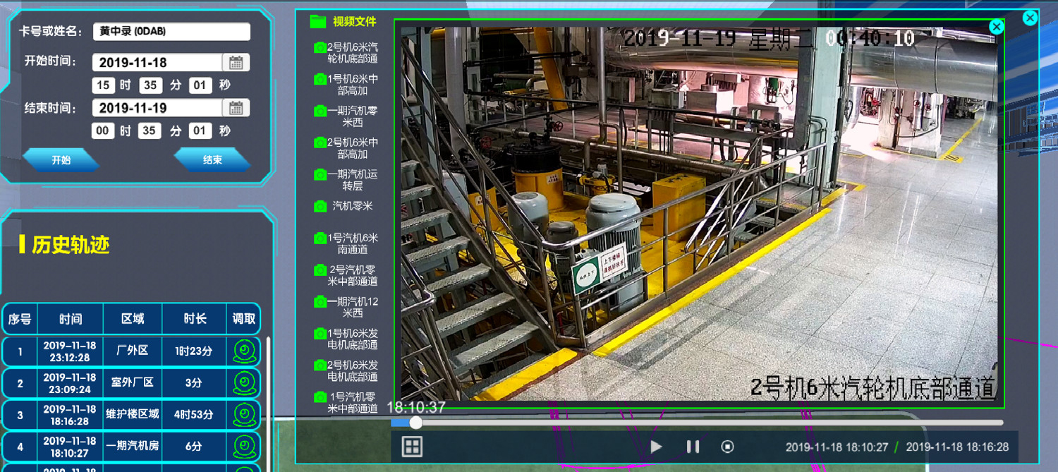系統(tǒng)支持接入電廠視頻監(jiān)控系統(tǒng),在三維電子地圖上顯示視頻監(jiān)控位置,任意切換調(diào)取視頻監(jiān)控。可實現(xiàn)快速查找、單點回放、圖像識別等功能。同時可基于人員當前位置自動調(diào)取對應(yīng)的視頻監(jiān)控,對人員行走到其他位置自動切換到相應(yīng)監(jiān)控畫面。對于發(fā)生異常的情況,可基于人員歷史軌跡不同位置及不同時段調(diào)取相應(yīng)位置相應(yīng)時間段的歷史視頻監(jiān)控,與歷史軌跡聯(lián)動播放,方便事故分析及責任劃定。