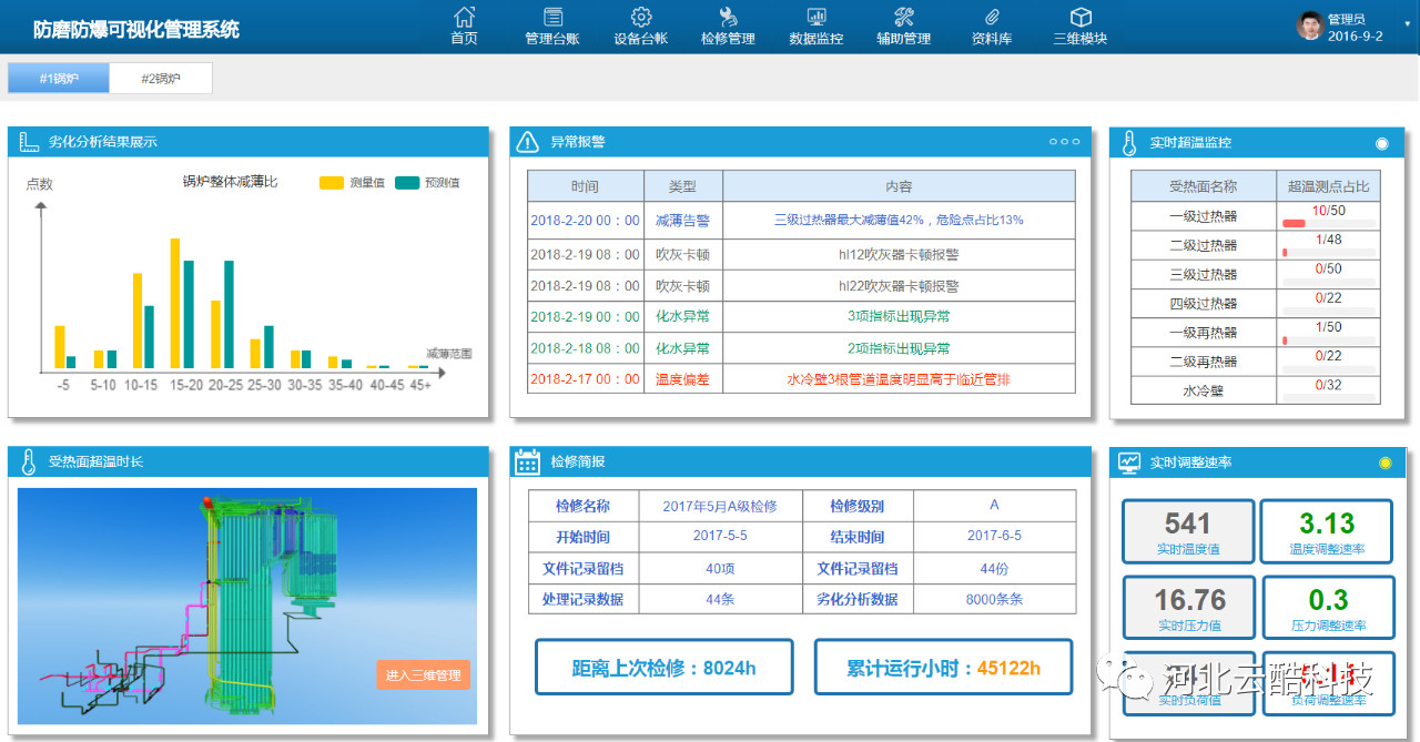 云酷科技多年來專注于電廠安全管理業務,針對鍋爐安全問題所研發的三維可視化鍋爐防磨防爆管理系統充分結合了先進的科技技術與電廠實際經驗,為鍋爐安全管理、四管泄爆問題提供管理工具。